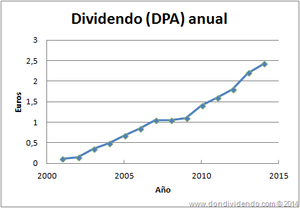 El promedio del crecimiento del dividendo se ha ralentizado últimamente, pasando del 20% de incremento en promedio en los últimos 10 años a un 14,5% en los últimos tres, sin embargo no podemos decir que el payout se encuentre disparado, más bien se encuentra en la zona habitual entre el 50% y 70%.