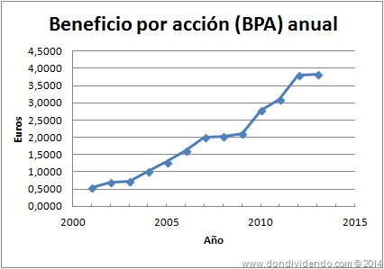 El reciente incremento del dividendo del 10% muestra el compromiso de Inditex con sus accionistas, incrementando el payout hasta el 63,3%. A continuación se muestra la evolución del BPA, dividendo y payout desde 2001.